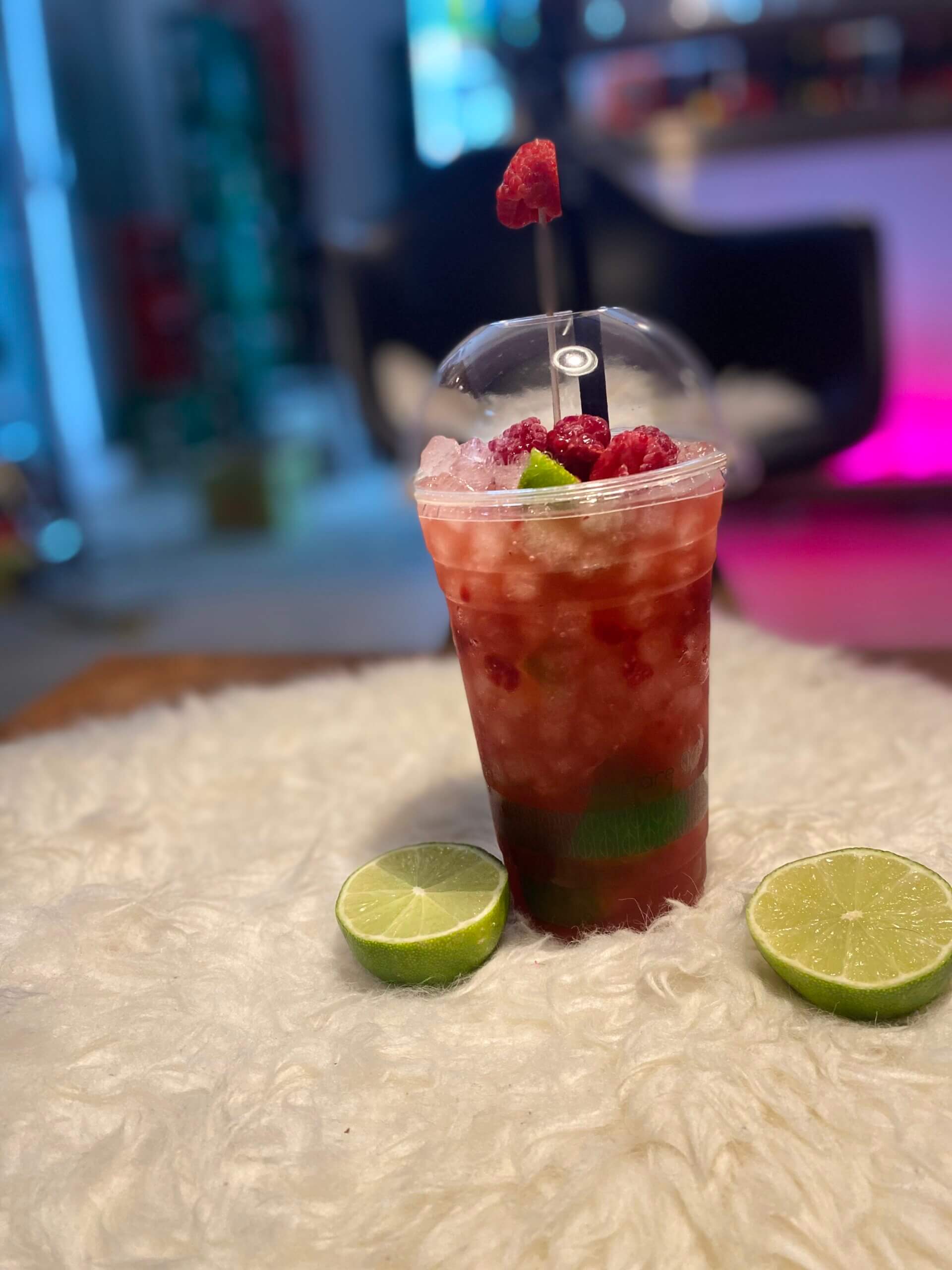 Mojito RazzLimette - Rohrzucker - Himbeersirup - gefrorene Himbeeren - Bacardi RAZZ - Himbeersaft - Sprite
